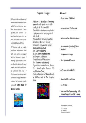 Dalle ore 15 si svolgerà il meeting generale nello spazio teatro della scuola, in via Ferraironi 38. I bambini costruiranno un plastico e spiegheranno il loro progetto di città ideale. Per ascoltare i giovani progettisti del futuro e dare loro risposte all’incontro prenderanno parte : la Dirigente Scolastica, dott. Laura Bellanova, la dott. Simonetta Salacone, già dirigente dell’Istituto, il presidente del VI Municipio dott. Giammarco Palmieri, il presidente Commissione Scuola del Municipio Roma VI ing. Massimo Lucà , il noto urbanista prof. Paolo Berdini dell’Università di Tor Vergata, Roma.