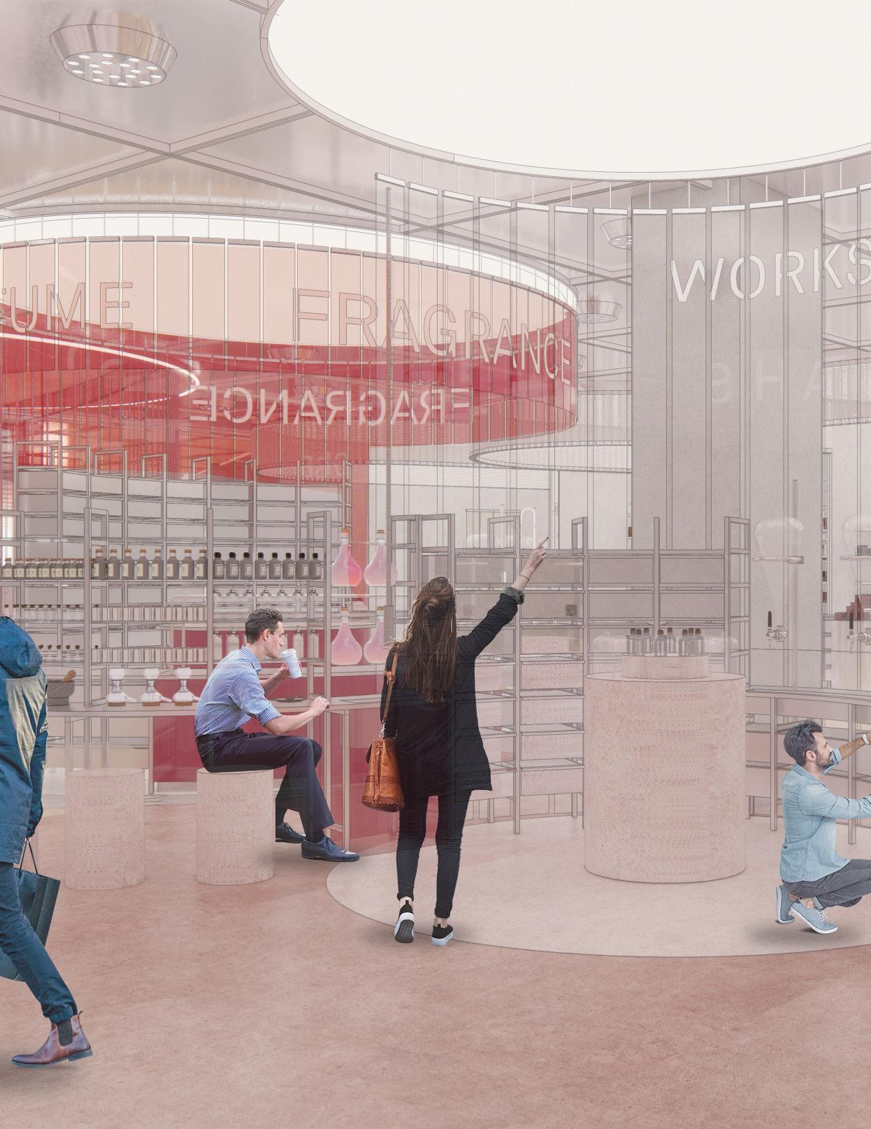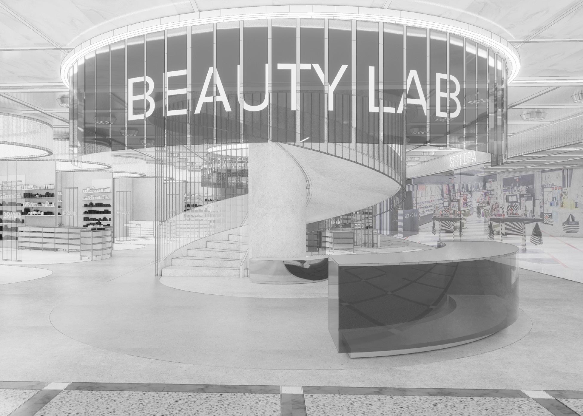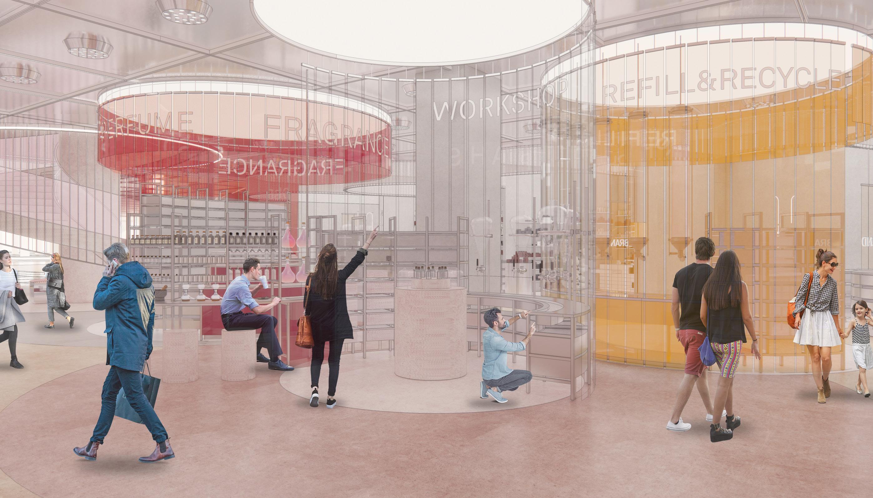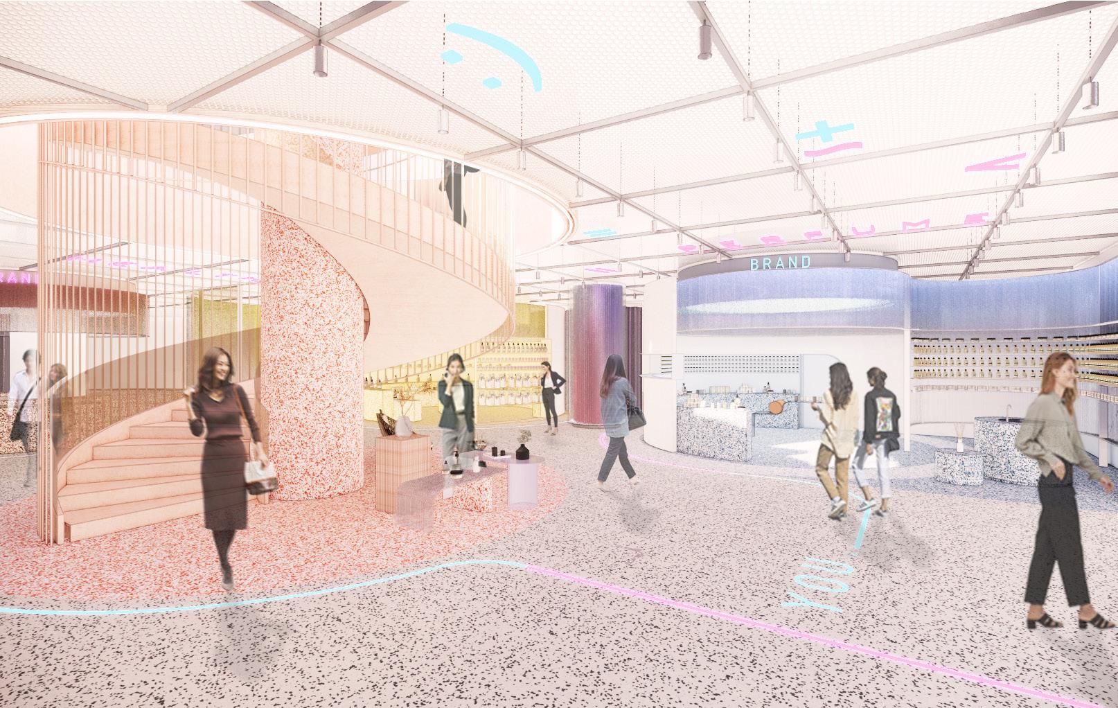 Trends in the beauty space point towards a gender neutral, fullycustomisable, curated, intelligent & sustainable future. Whether employed in the pop-up space across from the beauty area, or applied to the whole beauty area itself, these progressive features would act as a draw card for customers. The ‘Lab’ would host the most exciting new sustainable & innovative brands, feature the newest technology & experiences, becoming active participants in the conversation around the future of beauty.