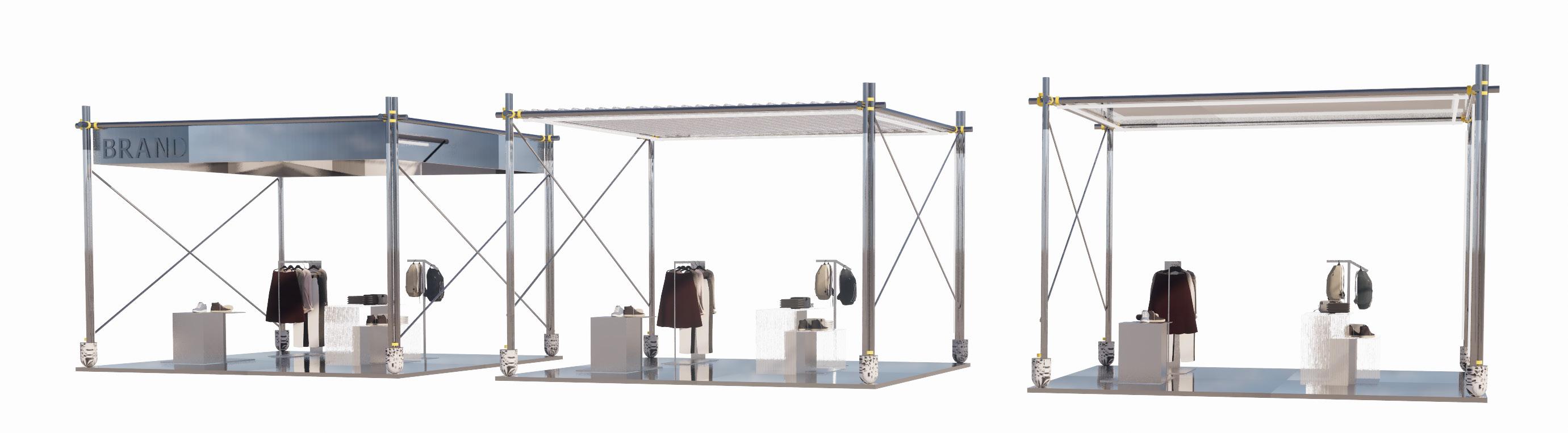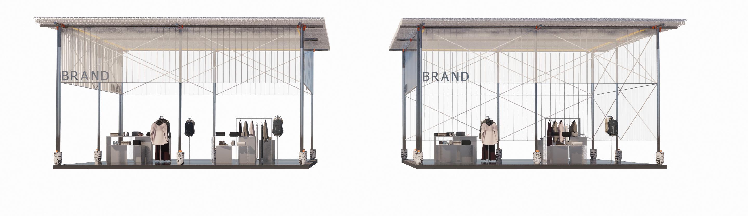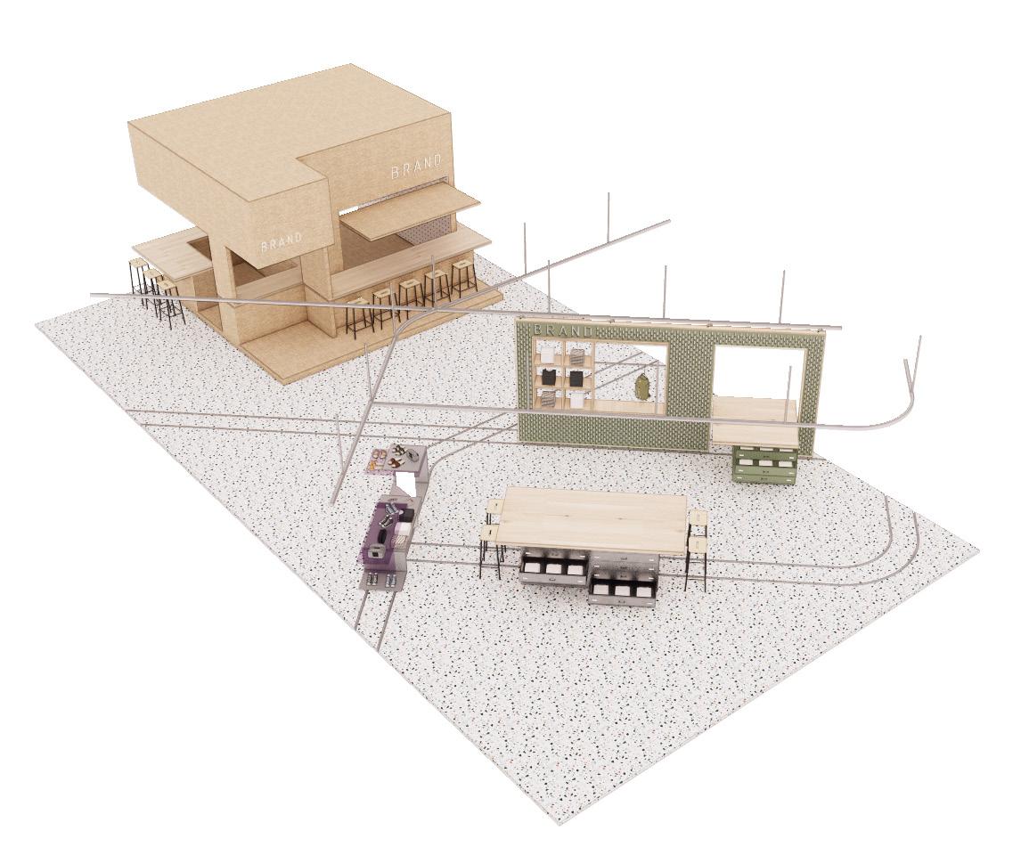 Staggered along the threshold of in-line retail stores, these sustainable chipboard booths have many of the same operable elements as the screens for openings, tables & inserts. Booths can be designed in conjunction with brands to ensure they work functionally for them.