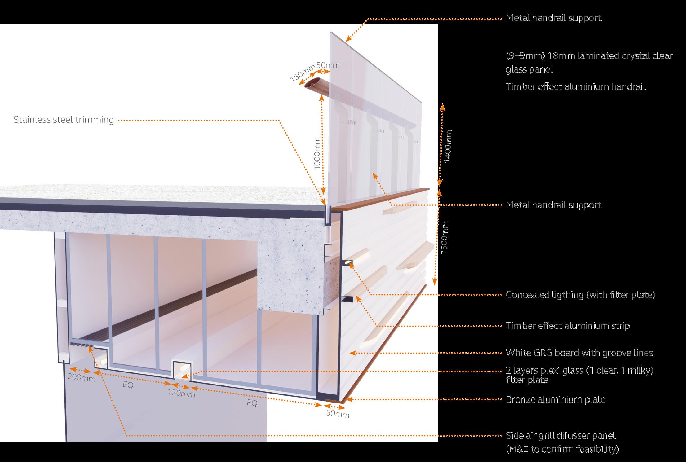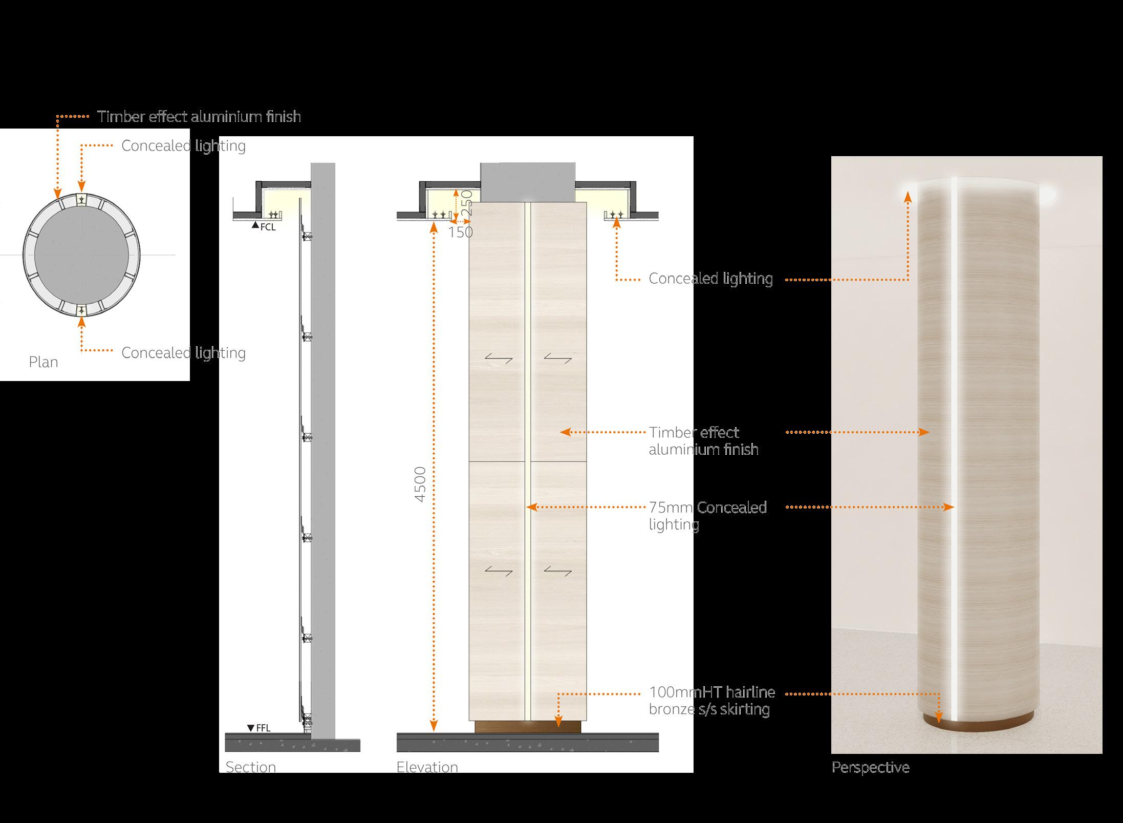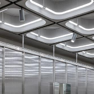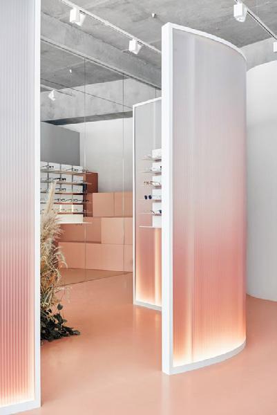 Gradient fluted glass with white metal Adisplay wrapping inside the outer layer & defining more specific spaces in the zone. Predominantly bulkhead height, dropping down in areas for display.