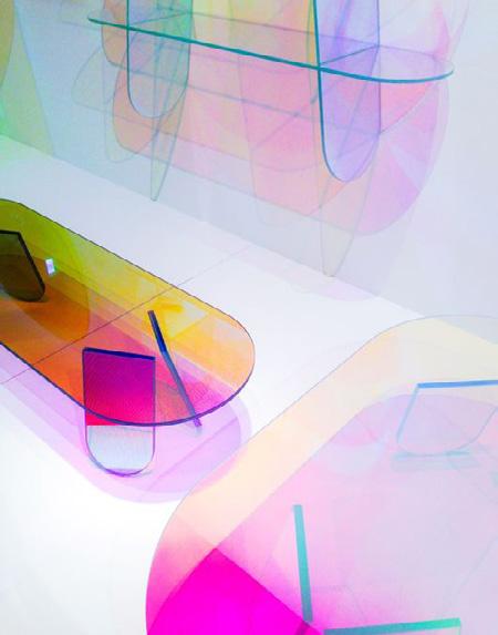 Coloured plastic sheets are contrasted with smooth stainless steel textures to create a laboratory feel, in a landscape of reflective, clean and transparent materials. Clean lines and forms echo the utilitarian environment of a laboratory, which are made playful with bold colours and interactive walls.