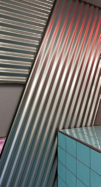 Tinted plastic sheets define the zones within the central space and between vendors. This bright, reflective, transparent pop of colour adds visual interest and vibrancy to the space when contrasted against the clean stainless steel.