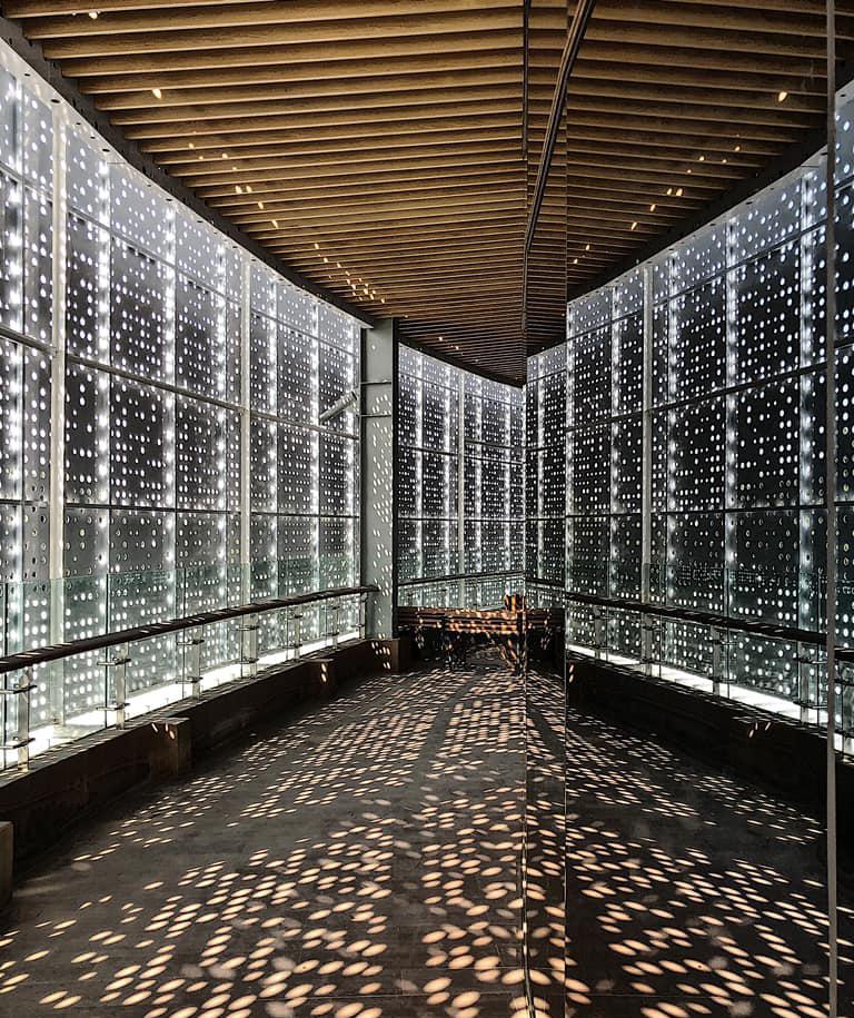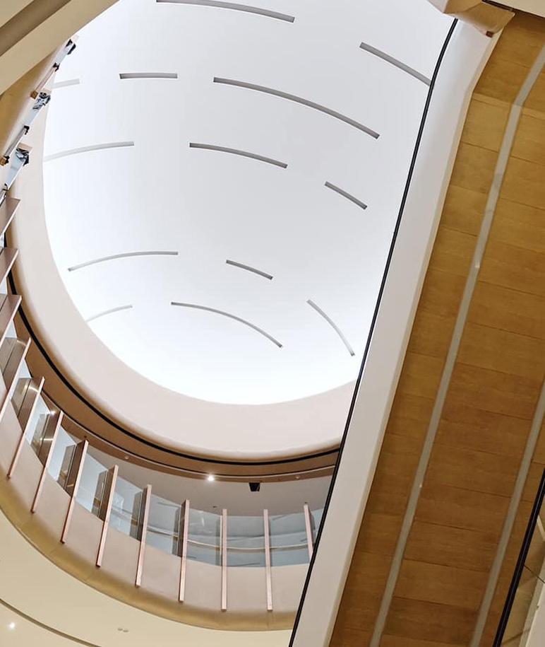 A s p e o p l e m o v e t h r o u g h t h e a t r i u m , t h e y m o v e t o w a r d s t h e n a t u r a l l i g h t a b o v e . T h e a t r i u m e m p h a s i s e t h i s a s t h e s p a c e g r a d u a l l y t r a n s i t i o n s f rom d a r k e r t o l i g h t e r , c r e a t i n g a n e p h e m e r a l , a l m o s t h e a v e n l y e x p e r i e n c e , a s t h e y a s c e n d .