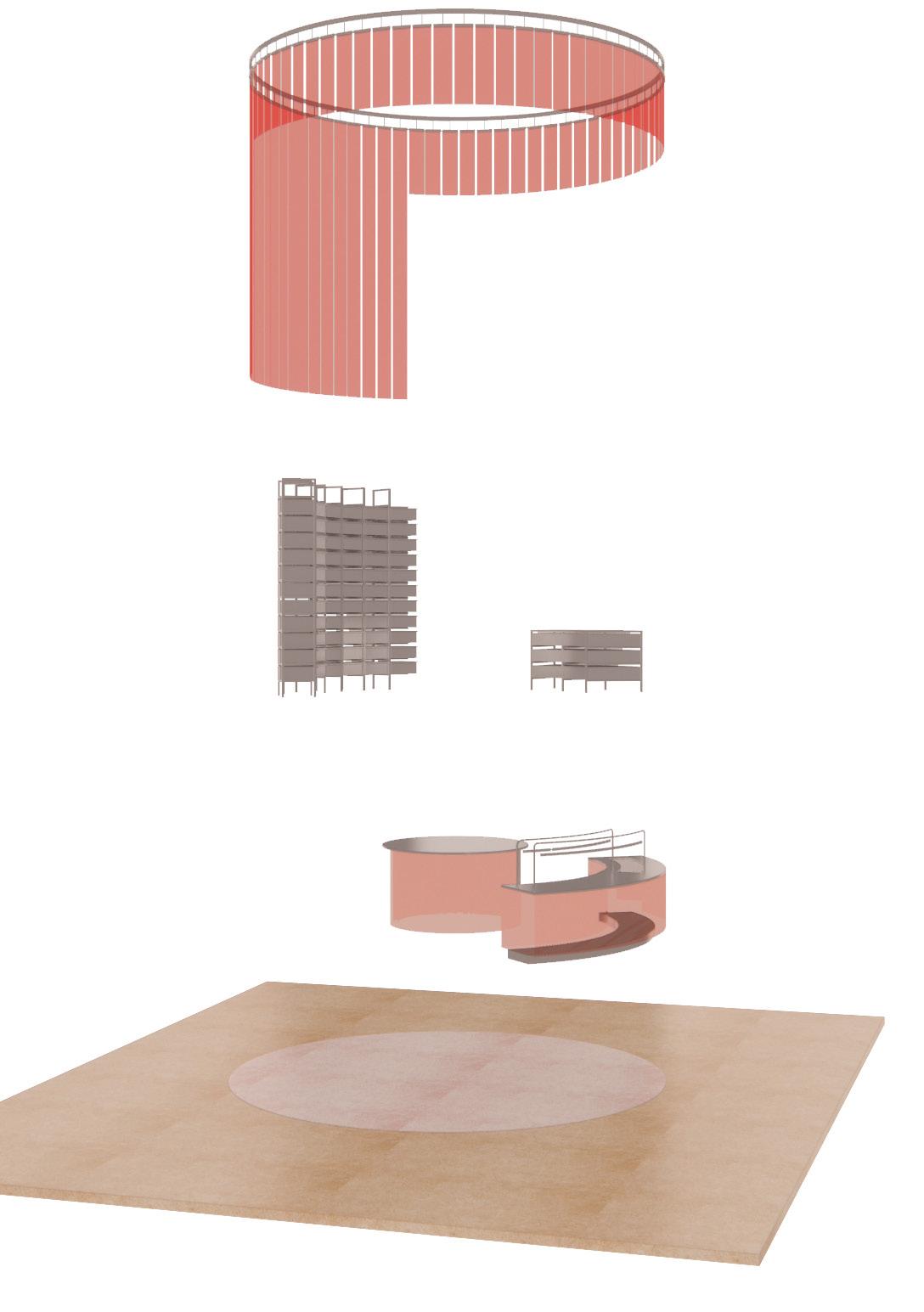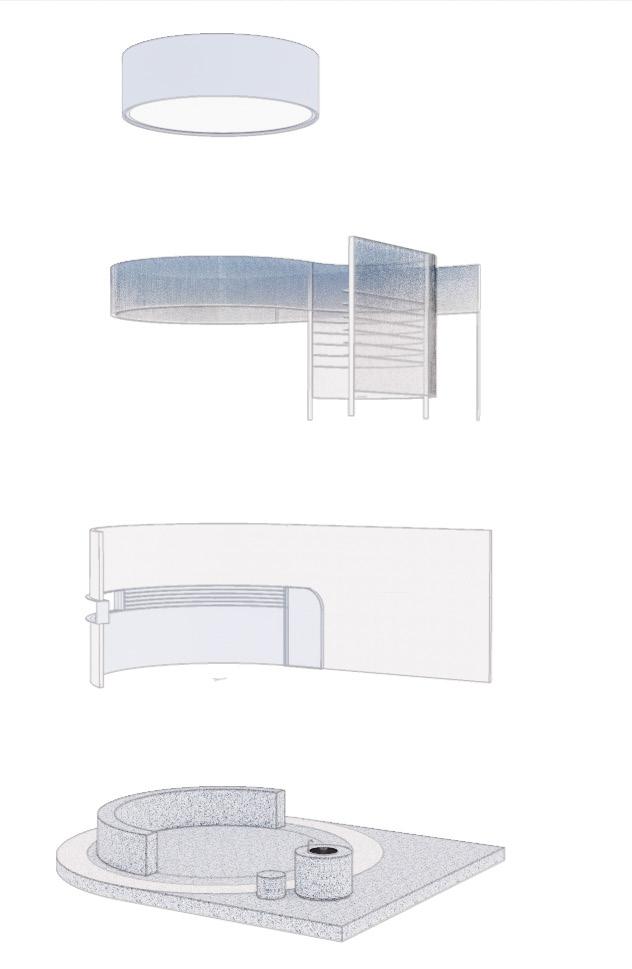 A series of curved rooms sit behind the monolithic wall, defining zones with variations on transparent & light materials for differing levels of privacy,