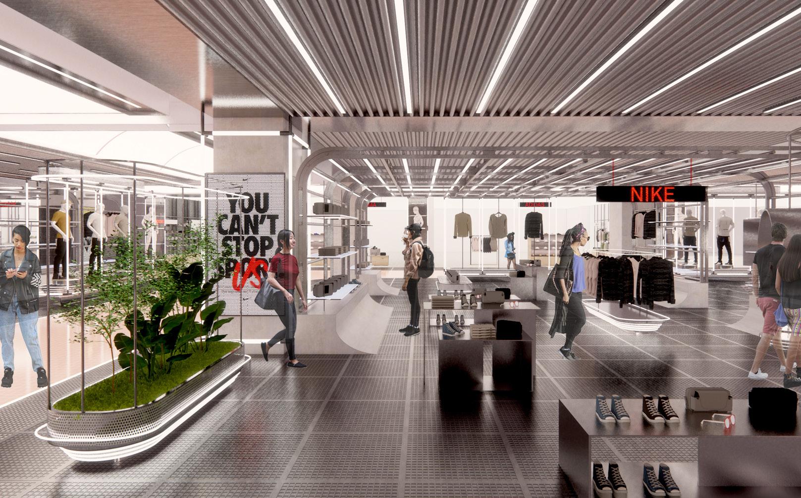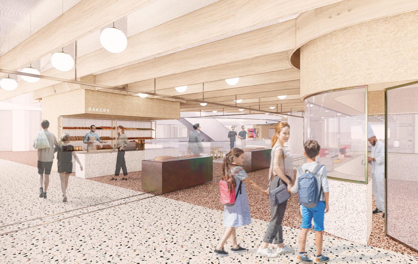 Minimal retail frontage aims to create a seamless feeling from the market space & circulation to the fixed retail. Scaffolding framing as used in the market area and a continuous floor help create the feeling of a single open space.