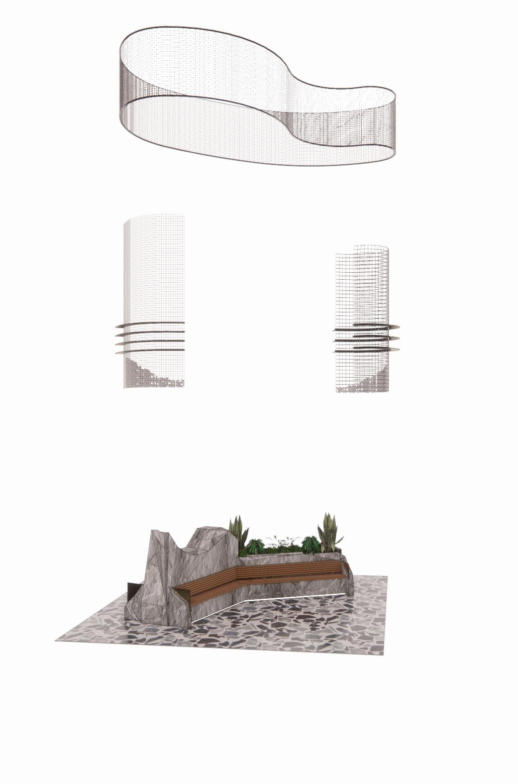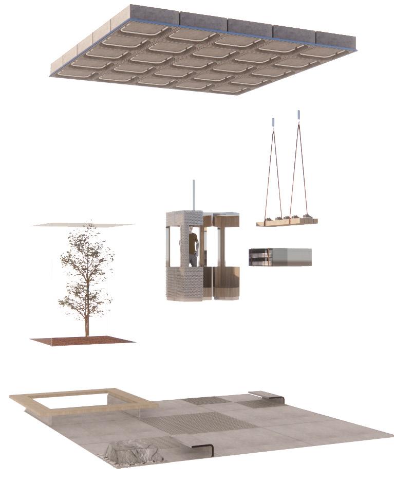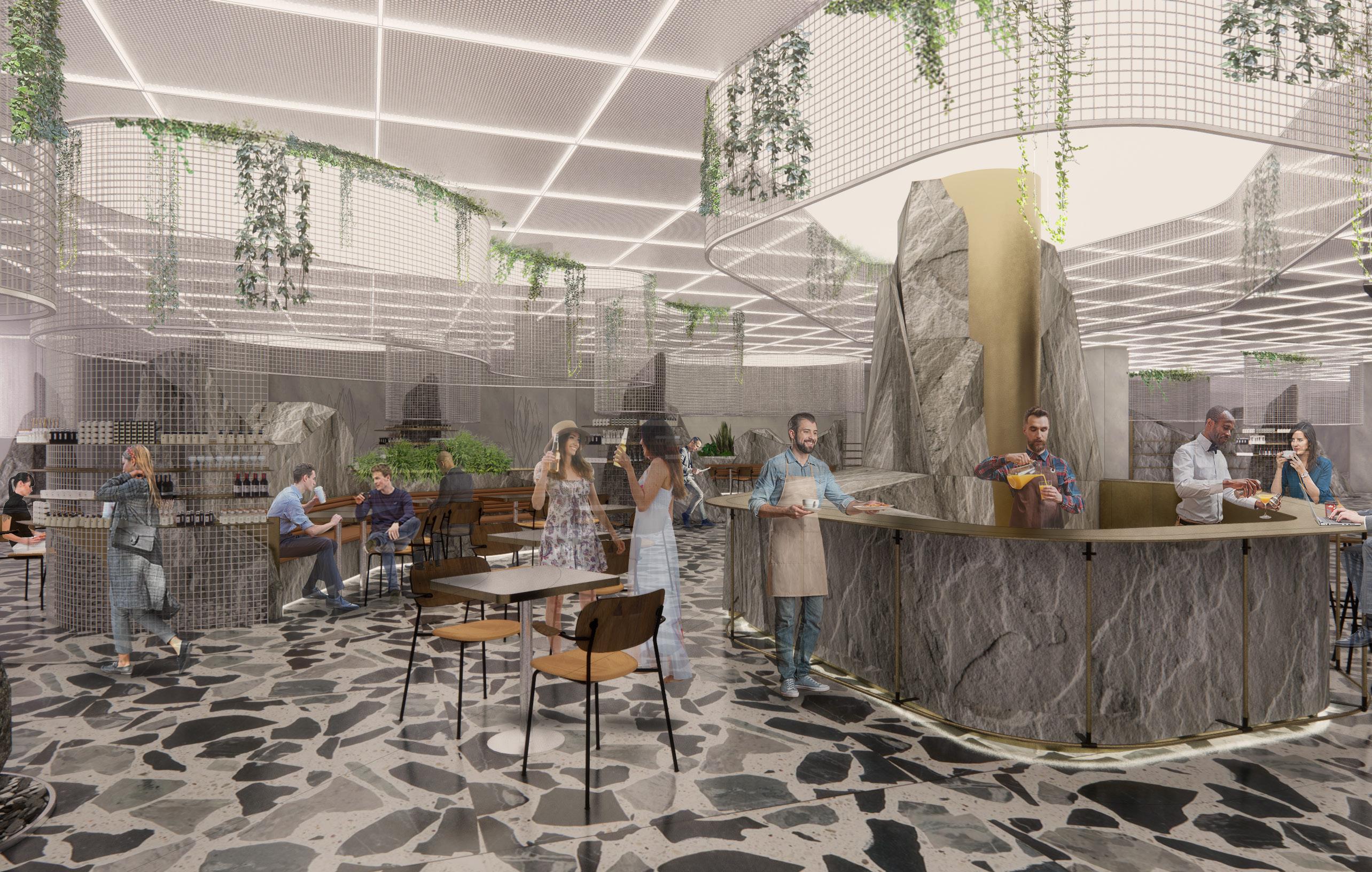 Emerging from the over-sized terrazzo floor, natural stone plinths sit under the floating cages. The rocks are carved to create spaces for banquette seating & greenery, expressed by thin, smooth
