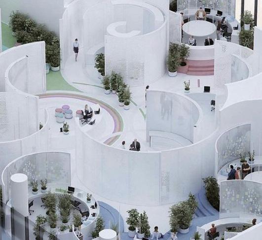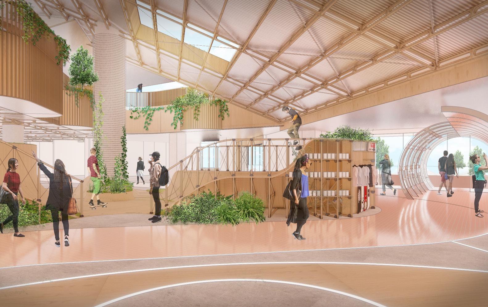 A series of undulating, organic-shaped plywood islands sit on the raw concrete floorplate. Greenery grows wild along these islands, blurring the boundary between urban