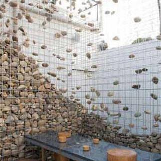 Metal mesh fill with natural gravel at varying heights to create differing levels of transparency.Shelves can hang off the cage creating moments for merchandising