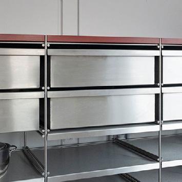 These workbenches have 8 drawers which can be used for product display or to house customisation accessories for workshops. An extended table edge offers a place to sit & the benches can be placed together to offer bigger surfaces to accomodate workshops.