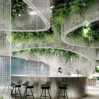 Organic shaped floating metal mesh cage defining key areas such as bar and seating. Where the cage hits the ceiling a backlit panel will sit. further defining
