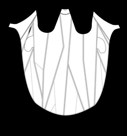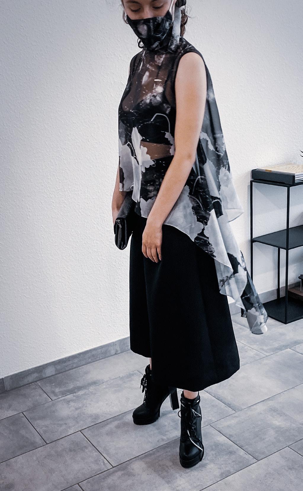 While the calm side is visualised by lightweight fabrics blown in the air and fluid looking material, as a presentation of smooth waters and quiet places, the uneasy side is shown in stiff and hard fabrics with a lot of volume, a contrasting print and some organic forms with sharp ends The combination of them will never be exactly equal, so I decided to go for asymmetrical silhouettes.