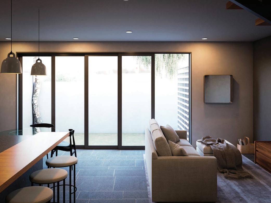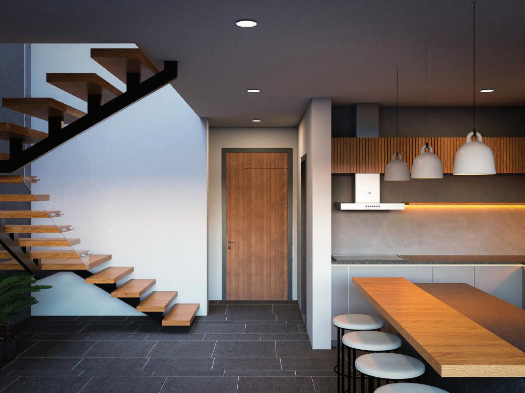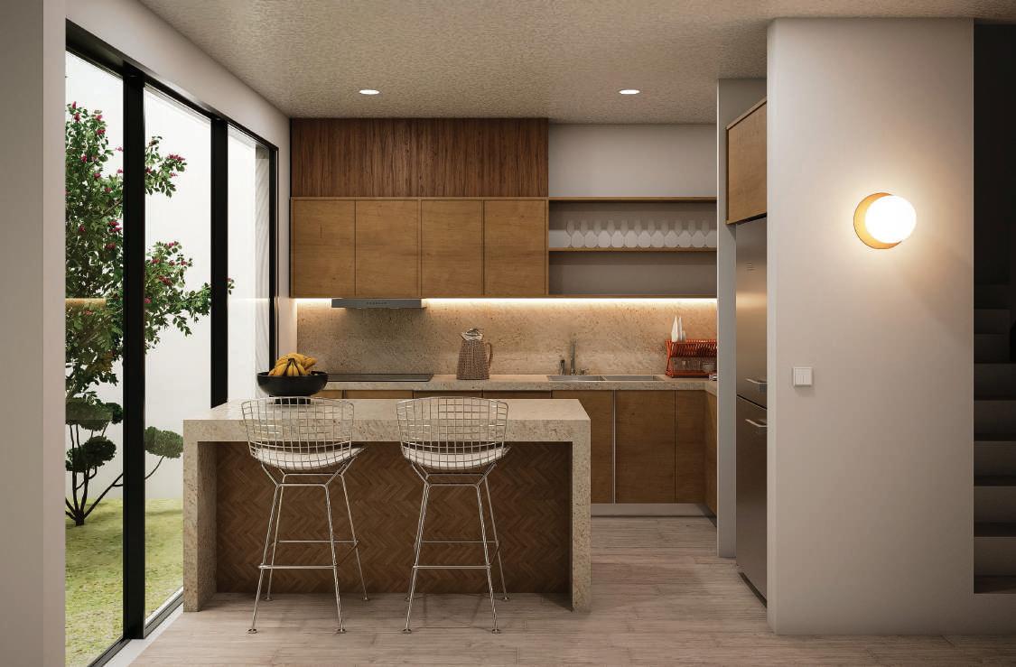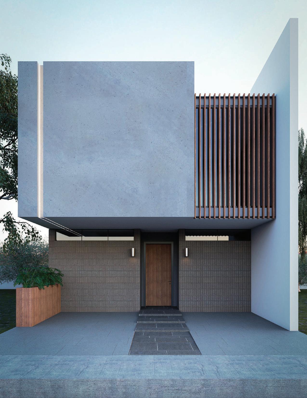 Casa para venta en la ciudad de Querétaro, tres recámaras cada una con baño, amplia cocina, comedor, sala contigua. De estilo contemporáneo, minimalista, incluye acabados en concreto, block estriado, madera nogal y loseta.