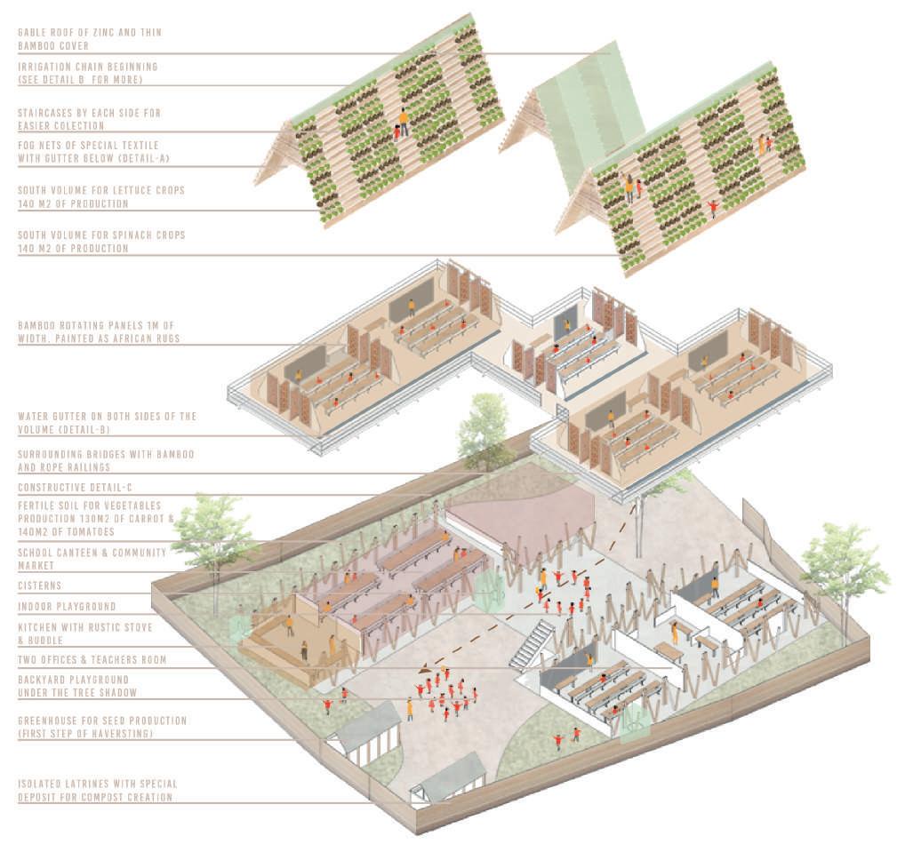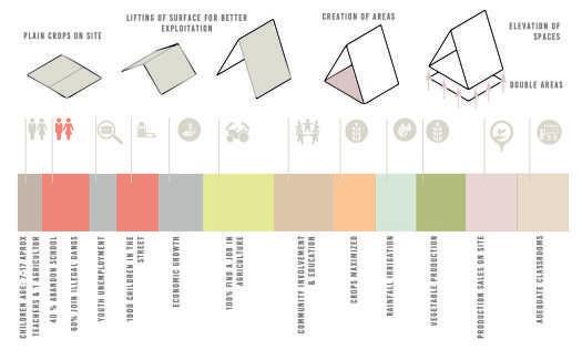 Senegal es un país rico en cultura, agricultura y tradiciones. Desafortunadamente, están pasando por una pequeña revolución en la zona de Casamance incluyendo Marsassom, en donde reclutan a niños de la calle para pelear, vender productos ilícitos y son inducidos al crimen. Esto se debe a la escaséz de oportunidades laborales para jóvenes, es por eso que este proyecto pretende aumentar sus oportunidades al inducir a los niños al sector de agricultura. En esta escuela los niños aprenden a cosechar y al mismo tiempo tienen la posibilidad de vender y comer sus productos. El objetivo es motivar a los adultos jóvenes a trabajar en este sector más favorable desde pequeños. El proyecto pretende invitar a la comunidad hacia mejores actividades económicas mientras que se crea un ambiente seguro de aprendizaje, lo que se logra con la forma, estructura y programa.