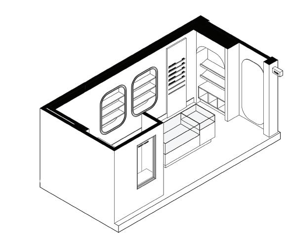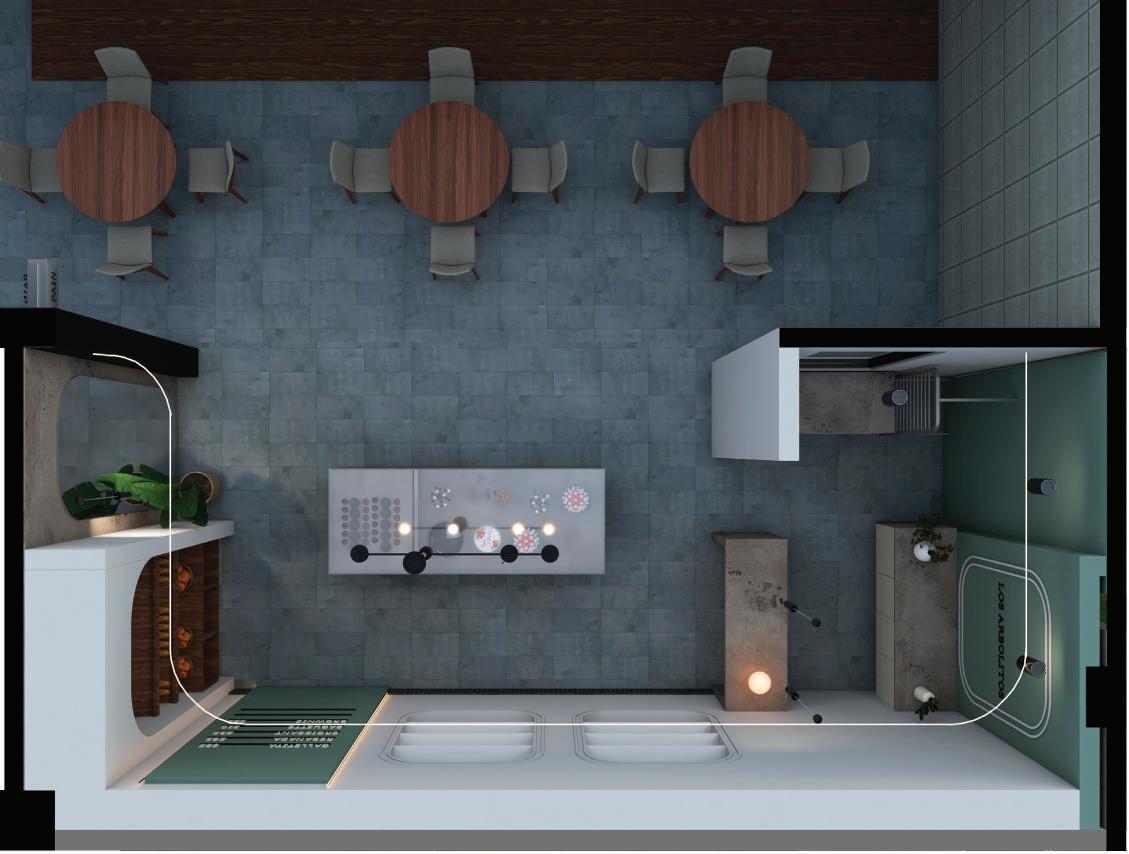 Intervención en restaurante existente para una panadería y repostería petit. El espacio se utilizará como exhibición únicamente, de panadería y postres. El espacio se organiza a partir de una isla central con refrigeración, para que los comensales puedan circular y observar todo el display. Se compone de zona de preparación, terminación, cobro, exhibición y autoservicio de pan. El concepto se sintetiza como minimal french, una combinación entre lo industrial existente del restaurante y la panadería tradicional francesa.