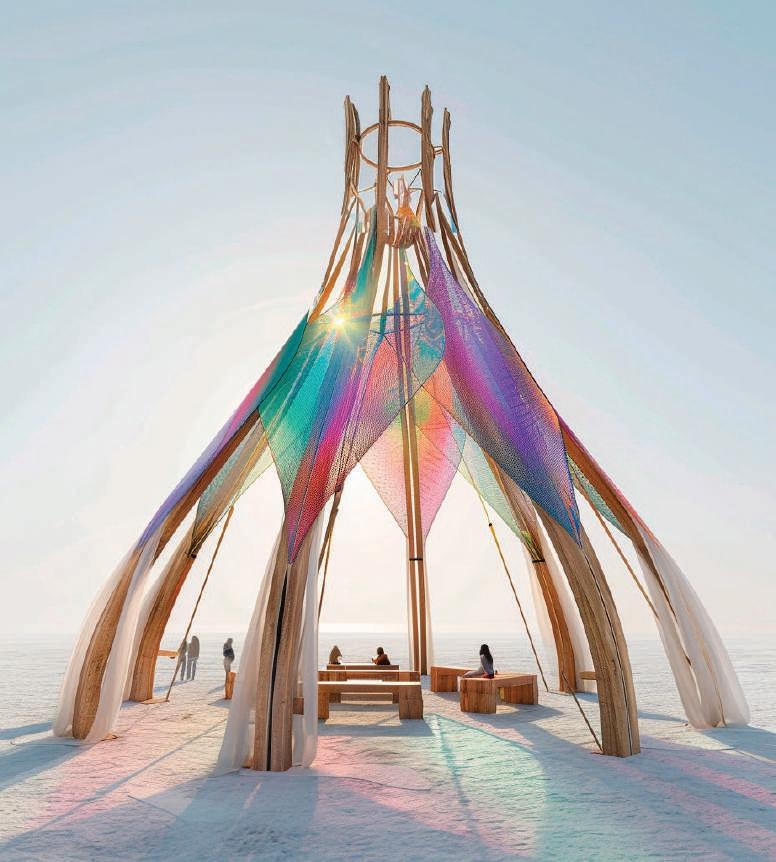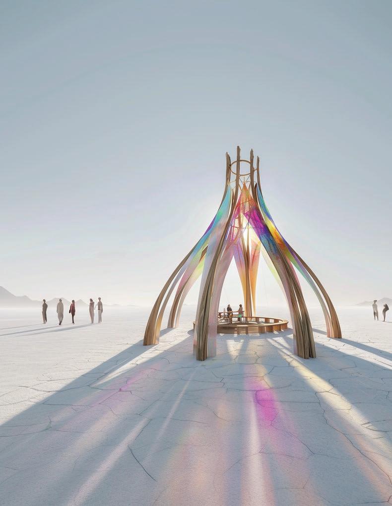 Con el objetivo de crear un comedor comunitario para el festival Burning Man, surge “The Nest” como pabellón arquitectónico que cumple su función inicial. Se compone de estructura híbrida entre madera y acero, una primer piel de tela beige que se sujeta a los postes para abrir o cerrar el área interior y finalmente una capa de tela translúcida multi color que permite el paso de los rayos solares reflejando un baile de colores en la superficie.
