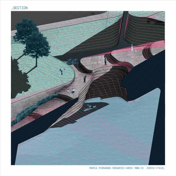 The way I interpreted these diagrams was by using the grid network as a series of contours, where spaces would rise and drop creating sectional experiences. The changes in elevation makes the user circulate between exterior ramps and interior pockets that both blend with each other. The idea is that the Different areas of the landscape are able to accommodate the existing and future programs necessary to the waterfront for the community. This instigating a process of development which will start to transform the community as a whole.