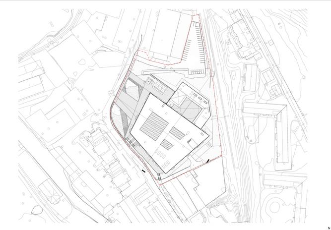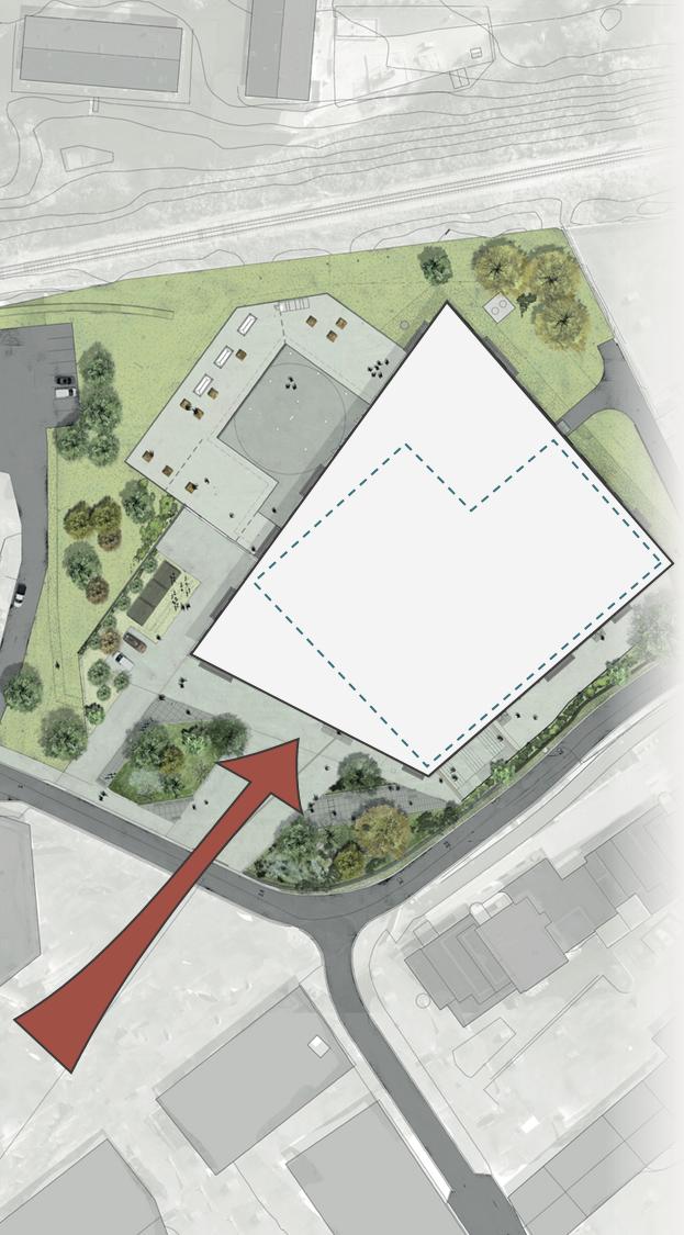 Entrada del edificio conectada con la gran plaza pública Edificio acogedor y abierto en diálogo con el centro de la ciudad.