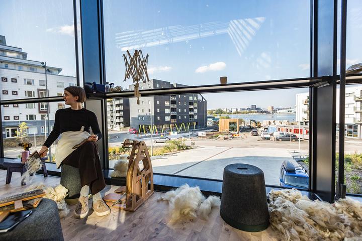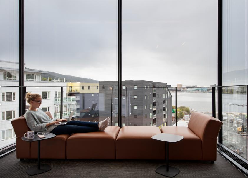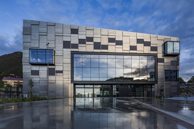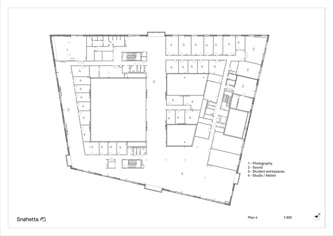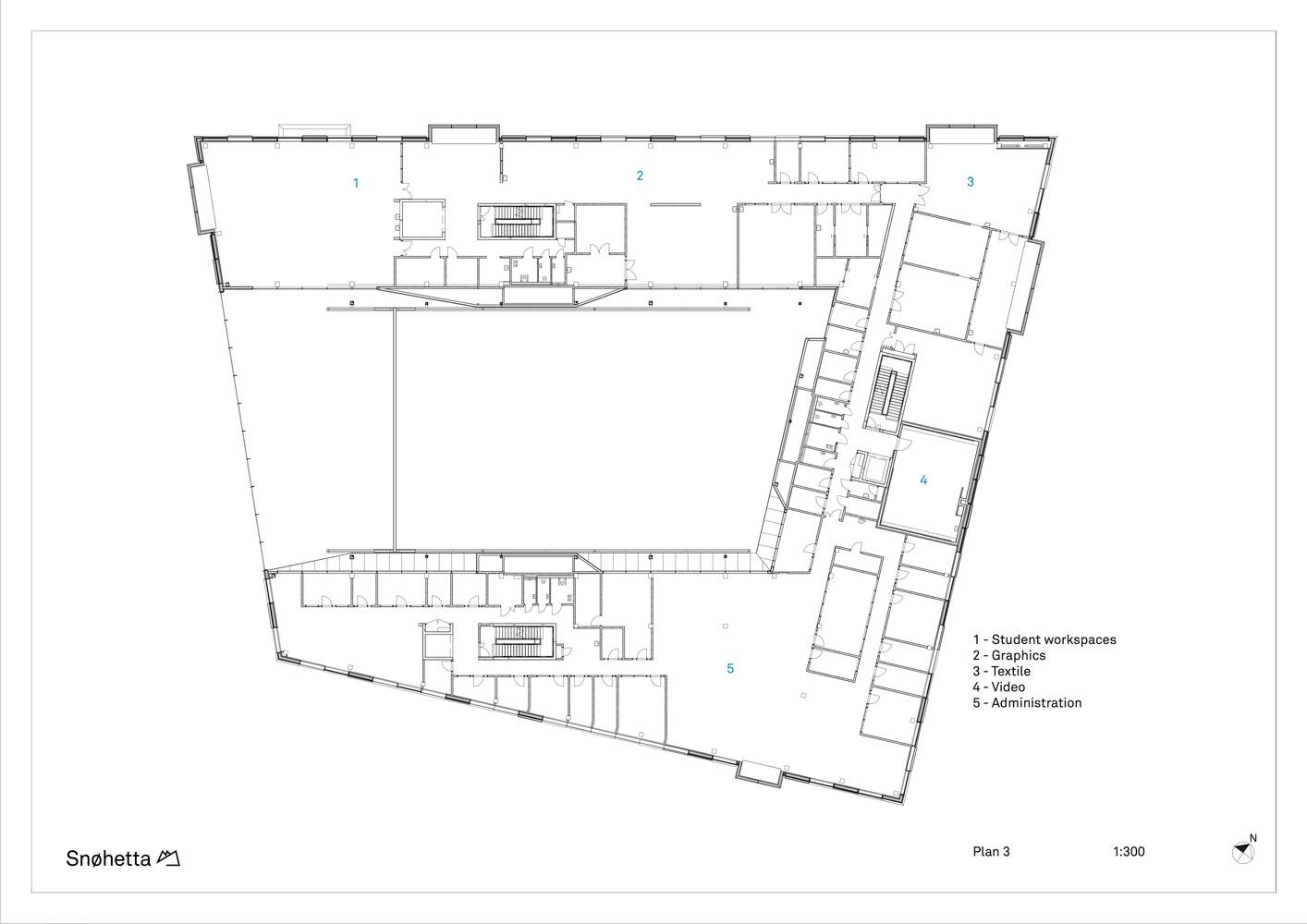 La paleta de materiales tiene una clara referencia a la costa noruega, utilizando materiales bien establecidos, como pisos de bloques de madera de pino, chapa de abedul, aluminio en bruto, acero en bruto y hormigón