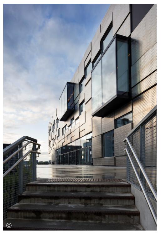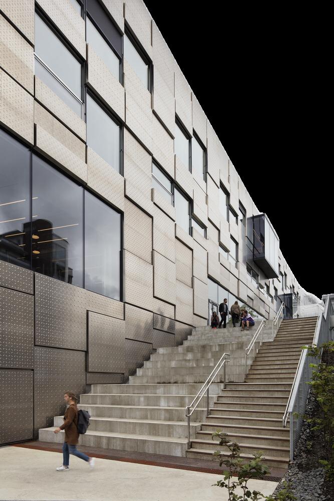 Los rieles y pasamanos de acero crudo se montan y sueldan en el sitio y cada transición se redondea cuidadosamente y es suave al tacto El hormigón vertido in situ se deja con las marcas meteorológicas dadas el día de la construcción. El uso de acero bruto también se refleja en los perfiles de los paneles de vidrio interiores y en las hojas de las puertas grandes y pesadas que conducen a los talleres en el nivel 1 y a la sala de proyectos en el nivel 2
