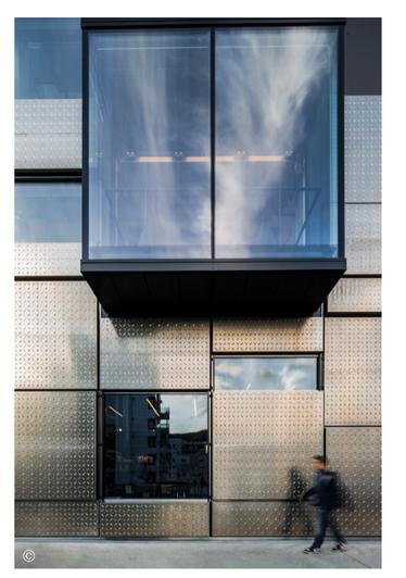 LLos elementos prefabricados de aluminio en bruto que revisten el exterior del edificio componen un rompecabezas de profundidad, anchura y longitud. 900 elementos de aluminio crudo resistentes al agua de mar de varios tamaños sobresalen de la pared a diferentes distancias, solo detenidos por grandes ventanas en forma de caja en voladizo que marcan el ritmo de la superficie de aluminio Los casetes de metal cambian según las condiciones climáticas de la costa oeste y refuerzan el efecto metálico del aluminio