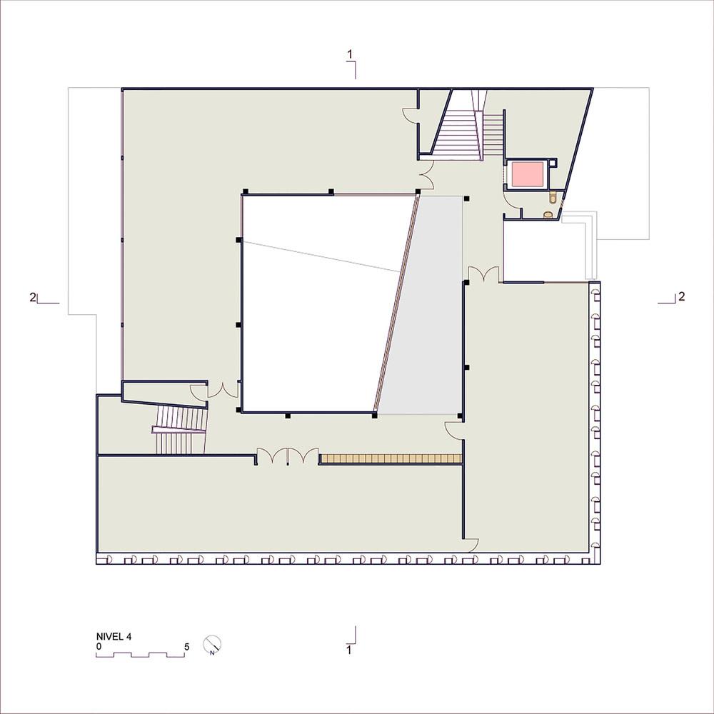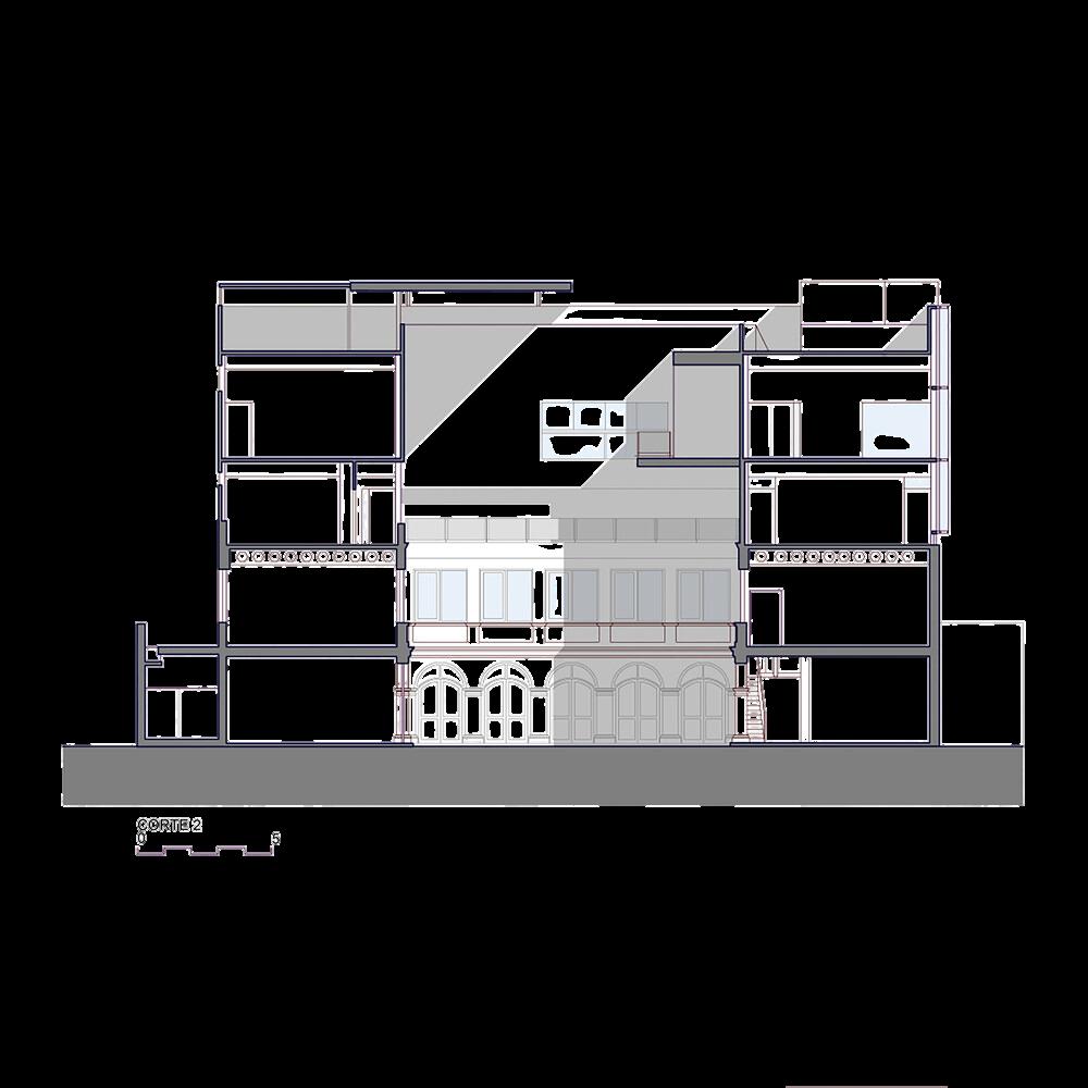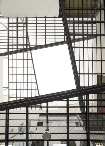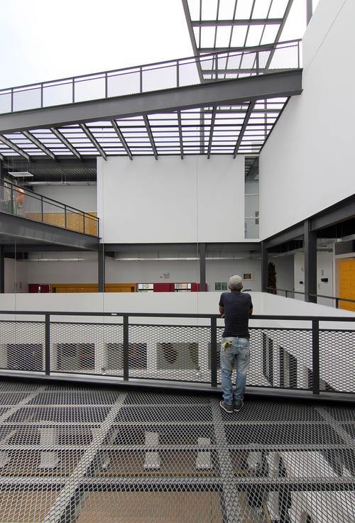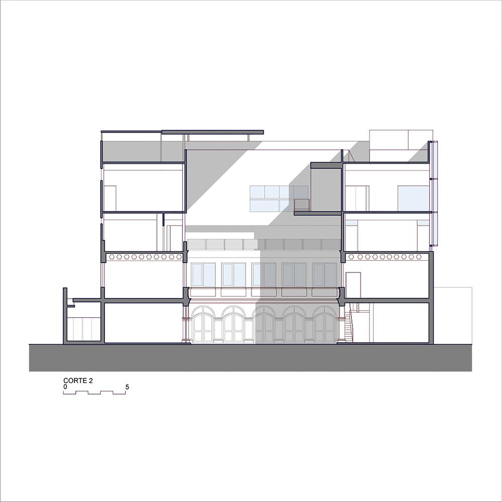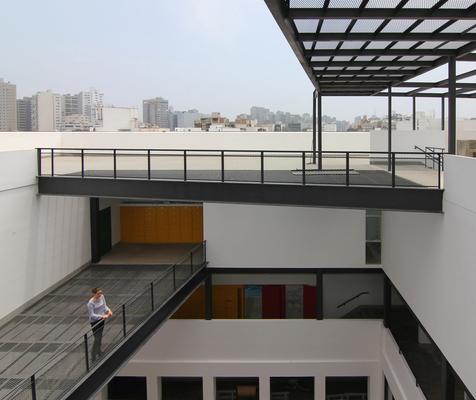En su interior, las dos escaleras existentes son prolongadas verticalmente y unidas por pasarelas metálicas que, a partir del tercer nivel, cruzan sobre el patio original para cumplir con las exigencias actuales de evacuación y seguridad contra incendios y sismos