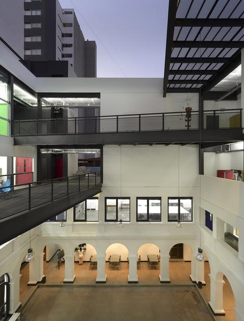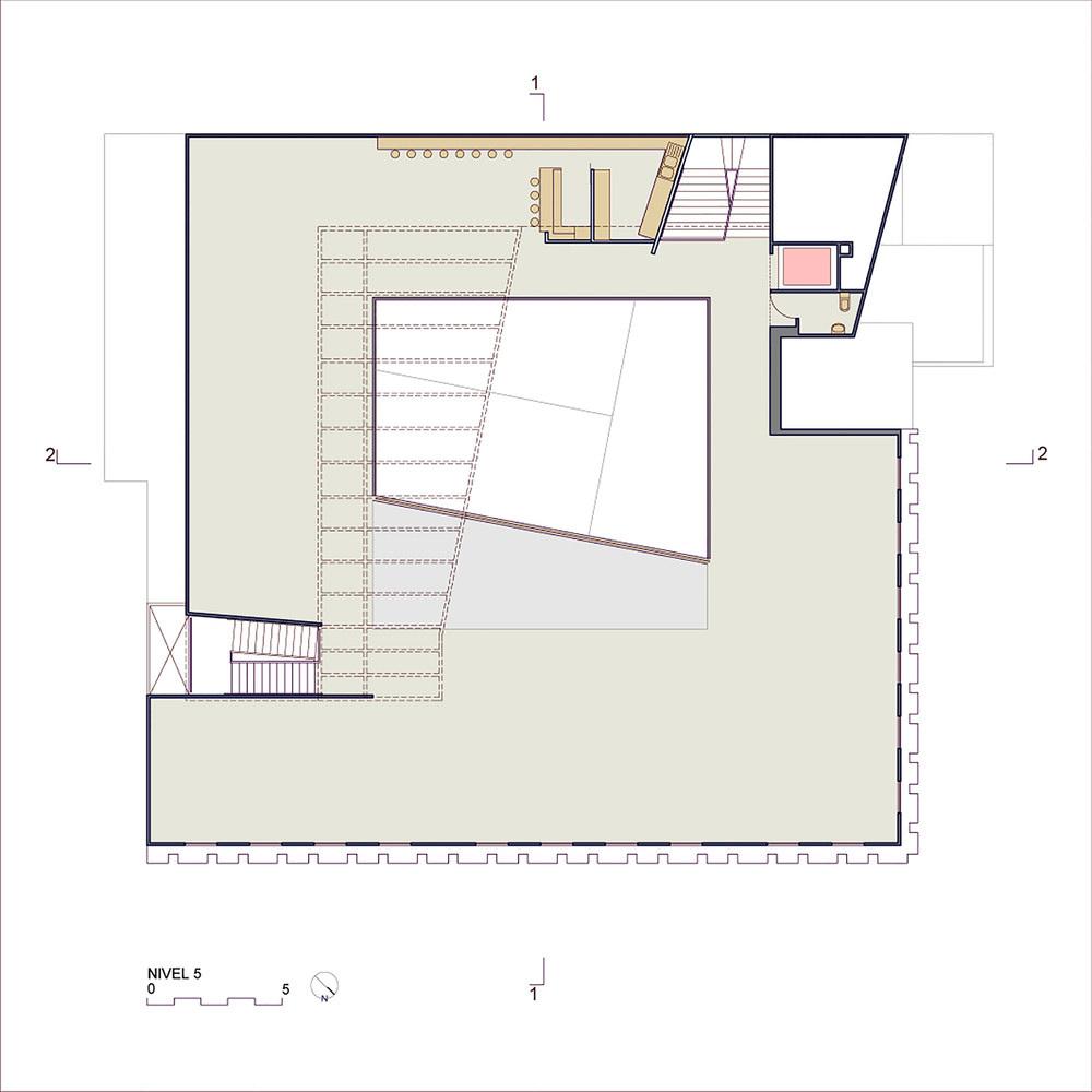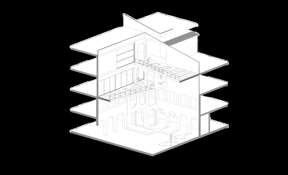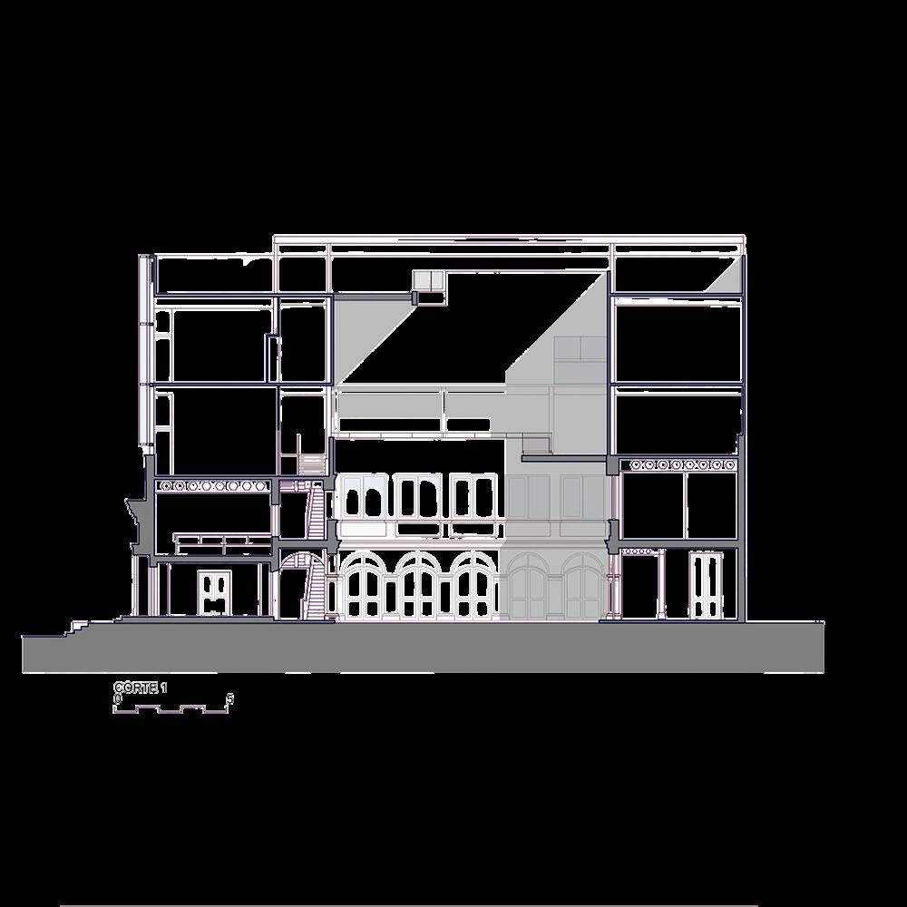 En su interior, las dos escaleras existentes son prolongadas verticalmente y unidas por pasarelas metálicas que, a partir del tercer nivel, cruzan sobre el patio original para cumplir con las exigencias actuales de evacuación y seguridad contra incendios y sismos
