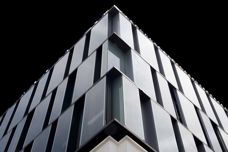 La piel acristalada es de ritmo aleatorio, con cristales templados fijos a dos plomos para crear un juego de luz y sombra naturales y dotada de aereadores en aluminio para asegurar una correcta ventilación Los aereadores poseen caras de distinto acabado (anodizado natural y laqueado negro) lo que genera una percepción de fachada cinética que cambia de aspecto según el sentido en que se aprecie