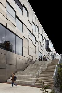 La fachada que se muestra al exterior del edificio componen un rompecabezas de 900 elementos de aluminio crudo