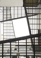 En su interior, hay una presecnia del concreto en paredes y el metal en las dos escaleras existentes son prolongadas verticalmente y unidas por pasarelas metálicas
