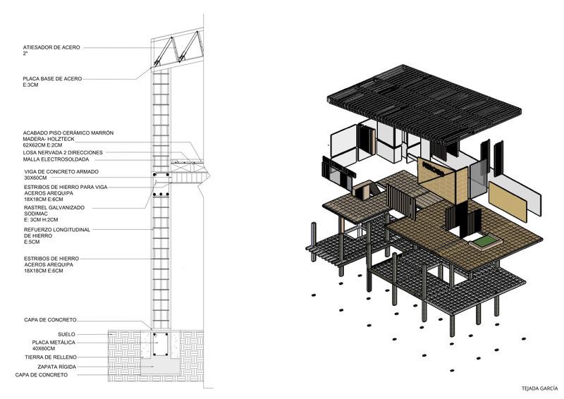 Hay diferentes alturas en los pisos para generar dobles alturas y relaciones espaciales La materialidad varía dependiendo del tipo de espacio: modulos, espacios interiores y exteriores, servicios.