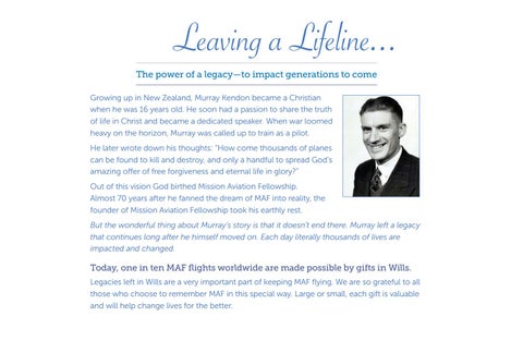Leaving a Lifeline... The power of a legacy—to impact generations to come Growing up in New Zealand, Murray Kendon became a Christian when he was 16 years old. He soon had a passion to share the truth of life in Christ and became a dedicated speaker. When war loomed heavy on the horizon, Murray was called up to train as a pilot. He later wrote down his thoughts: “How come thousands of planes can be found to kill and destroy, and only a handful to spread God’s amazing offer of free forgiveness and eternal life in glory?” Out of this vision God birthed Mission Aviation Fellowship. Almost 70 years after he fanned the dream of MAF into reality, the founder of Mission Aviation Fellowship took his earthly rest. But the wonderful thing about Murray’s story is that it doesn’t end there. Murray left a legacy that continues long after he himself moved on. Each day literally thousands of lives are impacted and changed.