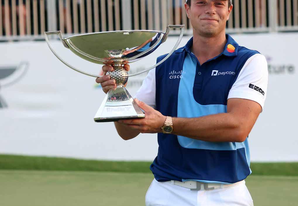 Hovland sluttede den netop overståede sæson på PGA Tour i overlegen stil, da han først snuppede sejren i den anden slutspilsturnering, BMW Championship, og ugen efter satte trumf på, da han også triumferede i The Tour Championship. For de to mindeværdige uger i august modtog han ikke blot to trofæer, men også en samlet check på næsten 150 millioner kroner. Særligt førstepræmien i årets sidste turnering på svimlende 18 mio. dollars