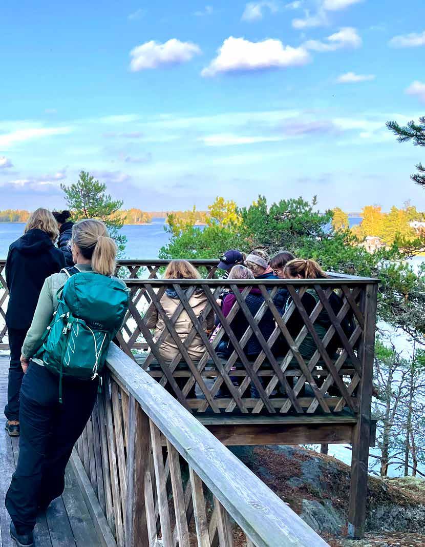 Vi samlas sedan i bastun på flytbryggan medan vi njuter av utsikten genom panoramafönstren och jag börjar citera den avslutande meningen i boken vi läst:
