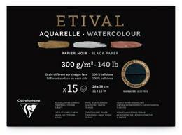 papier aquarelle Etival noir - 300 g/m2 Double grain au recto, un grain fin, polyvalent et facile à travailler ; au verso, un grain torchon • 100 % cellulose • Sans acide. Le papier Etival aquarelle noir à double grain est idéal pour tous les aquarellistes qui recherchent un grain prononcé. Ce papier est exceptionnel pour son double grain, offrant ainsi de belles alternatives à l’artiste. Ce papier possède quasiment les mêmes qualités que le papier pur coton : une excellente conservation, une très bonne capacité d’absorption et le repentir possible. Il s’adapte parfaitement bien aux travaux d’étude et permet des techniques très mouillées. feuille Prix par feuille. format *cde min. réf.