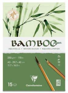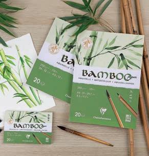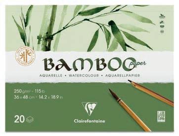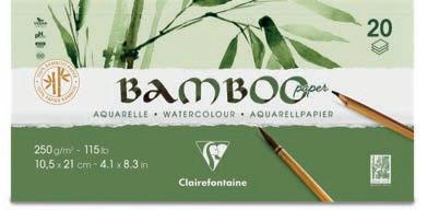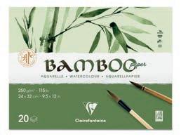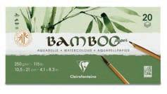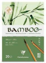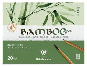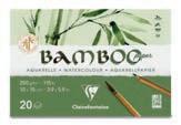 bloc de 20 feuilles Bamboo - 250 g/m2 Collé en tête • Surface à grain doux et très léger (pour réalisations en détail) • Blanc ivoiré, teinte “naturelle” • Dédié à l’aquarelle (Humide sur Humide), Lavis et autres Multi-techniques tels que le dessin au fusain, sanguine, pastel, aquarelle, acrylique etc. • Encollage végétal en cœur et en surface • Résistance (fibres longues) • Belle absorption, repentir aisé • Vegan Friendly • Garantie Archivale. Prix par bloc.