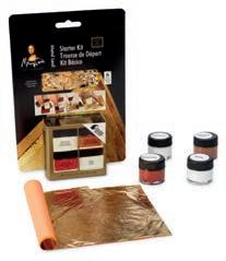starter Kit Or Contenu : 6 feuilles d’or de composition 14 x 14 cm, 1 flacon de fond rouge 7,4 ml, 1 flacon d’apprêt adhésif 7,4 ml, 1 flacon de vernis pour patiner 7,4 ml et 1 flacon de produit scellant 7,4 ml. Prix par kit. unité réf. Prix de lancement kit 5-66723 13,50 €ttc