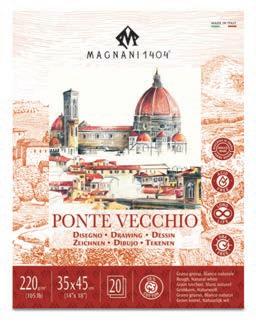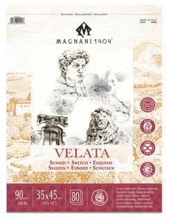 Collé en tête • Surface à grain doux et très léger (pour réalisations en détail) • Blanc ivoiré, teinte “naturelle” • Dédié à l’aquarelle (Humide sur Humide), Lavis et autres Multi-techniques tels que le dessin au fusain, sanguine, pastel, aquarelle, acrylique etc. • Encollage végétal en cœur et en surface • Résistance (fibres longues) • Belle absorption, repentir aisé • Vegan Friendly • Garantie Archivale. Prix par bloc.