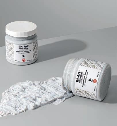 utilisés pour créer des textures granulaires. Ils se mélangent facilement avec les couleurs et les médiums acryliques Tri-Art pour créer une variété d’effets. Les gels Nepheline offrent la même souplesse et les mêmes qualités adhésives que les autres gels professionnels Tri-Art et peuvent fournir une surface intéressante pour les applications mixtes et les fonds texturés.