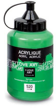 Peinture moderne, l’acrylique est appréciée par de très nombreux artistes. D’un rapport qualitéprix sensationnel, l’acrylique I love Art offre une consistance généreuse, qui la rend agréable à appliquer, et des nuances intenses à votre inspiration. Une fois sèche, elle forme une couche indélébile et soluble à l’eau si vous souhaitez effectuer des reprises ou produire des effets. Elle se distingue également par son opacité et son excellente résistance à la lumière. Très polyvalente, l’acrylique I Love Art convient aussi bien aux lavis qu’aux collages, superpositions et effets de matière. Elle conserve bien la trace de votre pinceau ou couteau à peindre en application épaisse. Vous pouvez l’utiliser sur papier, toile, carton, bois et tissu entre autres. Veuillez compléter la réf. par le n° de couleur de votre choix. Prix par tube ou par flacon. unité réf. €ttc