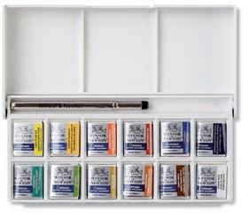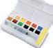 Dimensions des demi-godets : 15 x 12 mm. Coffret “tout en un” de demi-godets d’aquarelle fine. 12 couleurs vibrantes, de bonne tenue lumière. Sa palette intégrée, son pinceau réservoir, et son éponge rendent son utilisation parfaite pour un usage nomade et en plein air. Prix par coffret.