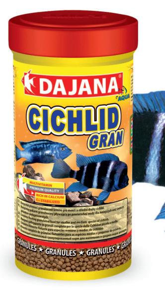Doplnkové granulované krmivo pre malé a stredné cichlidy Pestrá zmes vybraných surovín a vitamínov podporuje zdarný rast a zdravie rýb