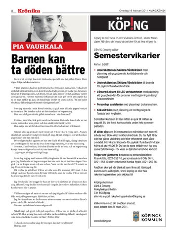 Semestervikariaten är från mitten av juni till mitten av augusti. Du bör helst kunna arbeta under hela sommarperioden. Vi söker dig som är intresserad av människor och som vill arbeta med äldre eller funktionshindrade. Du har fyllt 18 år och har gärna utbildning och/eller erfarenhet inom vårdområdet. För vikariat i boende för psykiskt funktionshindrade krävs att du fyllt 20 år. Du kan ta egna initiativ och har god samarbetsförmåga. För vissa av tjänsterna behövs körkort. Frågor om tjänsterna besvaras av personalassistent Pirjo Anttila, 0221-258 10, personalassistent Cilla Öhrn, 0221-258 10 eller enhetschef Annika Nylén, 0221-250 76. Ansökan sker på vår blankett som finns att hämta på kommunens webbplats, www.koping.se eller hos rekryteringsenheten, och skickas till Köpings kommun Vård & Omsorg Rekryteringsenheten 731 85 Köping eller via e-post rekryteringsenheten@koping.se Välkommen med din ansökan snarast, dock senast den 21 mars 2011.