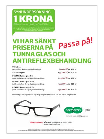 gäller endast i: kÖping: Storagatan 16, 0221-121 05. www.specsavers.se Gäller när du köper bågar från 395 kr inklusive enkelslipade standardglas eller med progressiva standardglas från 1000 kr extra. Vid val av andra glas eller ytbehandlingar tillkommer kostnad för båda glasögonen enligt ordinarie prislista. Kan ej kombineras med andra erbjudanden. Gäller endast i denna butik.