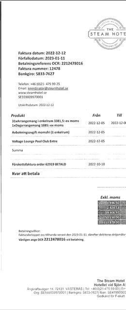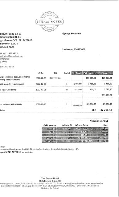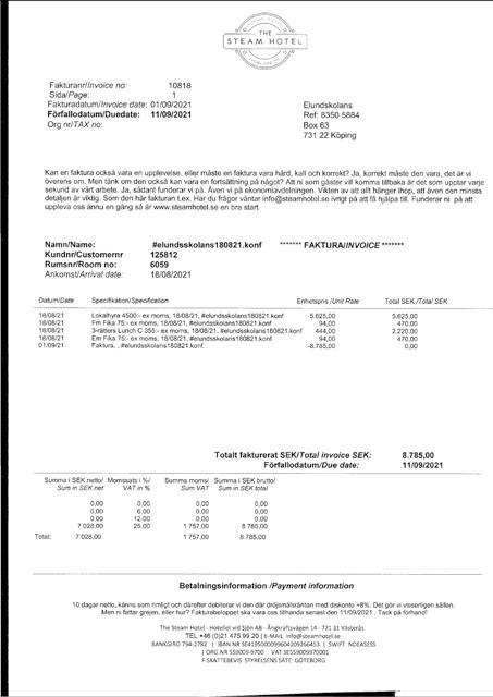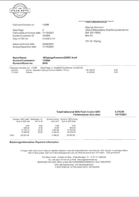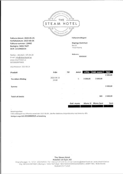 En faktura daterad 17 november 2021 anger endast ”Konferensarrangemang”. Summan är 36 269 kronor, utan närmare specifikation på deltagare. HR-avdelningen, Köpings kommun besökte Steam Hotel med tio personer 30–31 mars 2022. HRchef Tove Svensk har tillsammans med personalkontorets HRspecialister utnyttjat hotellet för en tvådagarskonferens med övernattning. Fakturan visar att sällskapet bott i ett dubbelrum