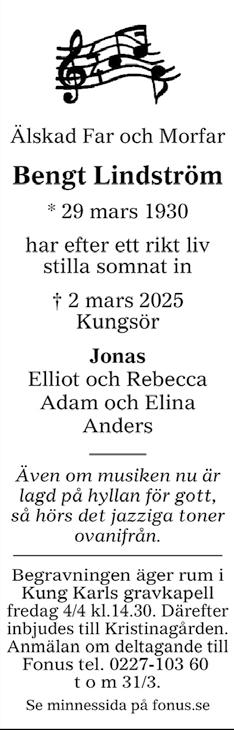 Begravningen äger rum fredagen den 11 april kl. 14.30 i Kung Karls kyrka. Valfri klädsel. Efter akten inbjudes till minnesstund. Anmälan om deltagande till Fonus tel.0227-103 60 senast den 7 april. Se fonus.se/minnessidor