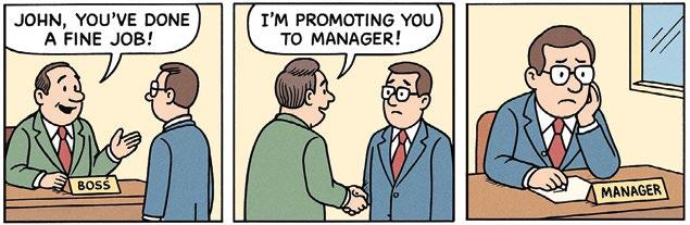 för att bli ”någon”. Tänk om vi såg karriär som bredd, inte bara höjd. Tänk om vi vågade prata om kompetens som något som inte alltid växer med befordran utan ibland stannar där den redan blomstrar. Vi älskar att skratta åt inkompetenta chefer i serier som e O ce eller Bonusfamiljen. Men Peters princip nns överallt. Hos kommunikatörer som aldrig kommunicerar. Hos projektledare som inte leder. Hos politiker som slutat förstå sina väljare. Ibland till och med i oss själva.