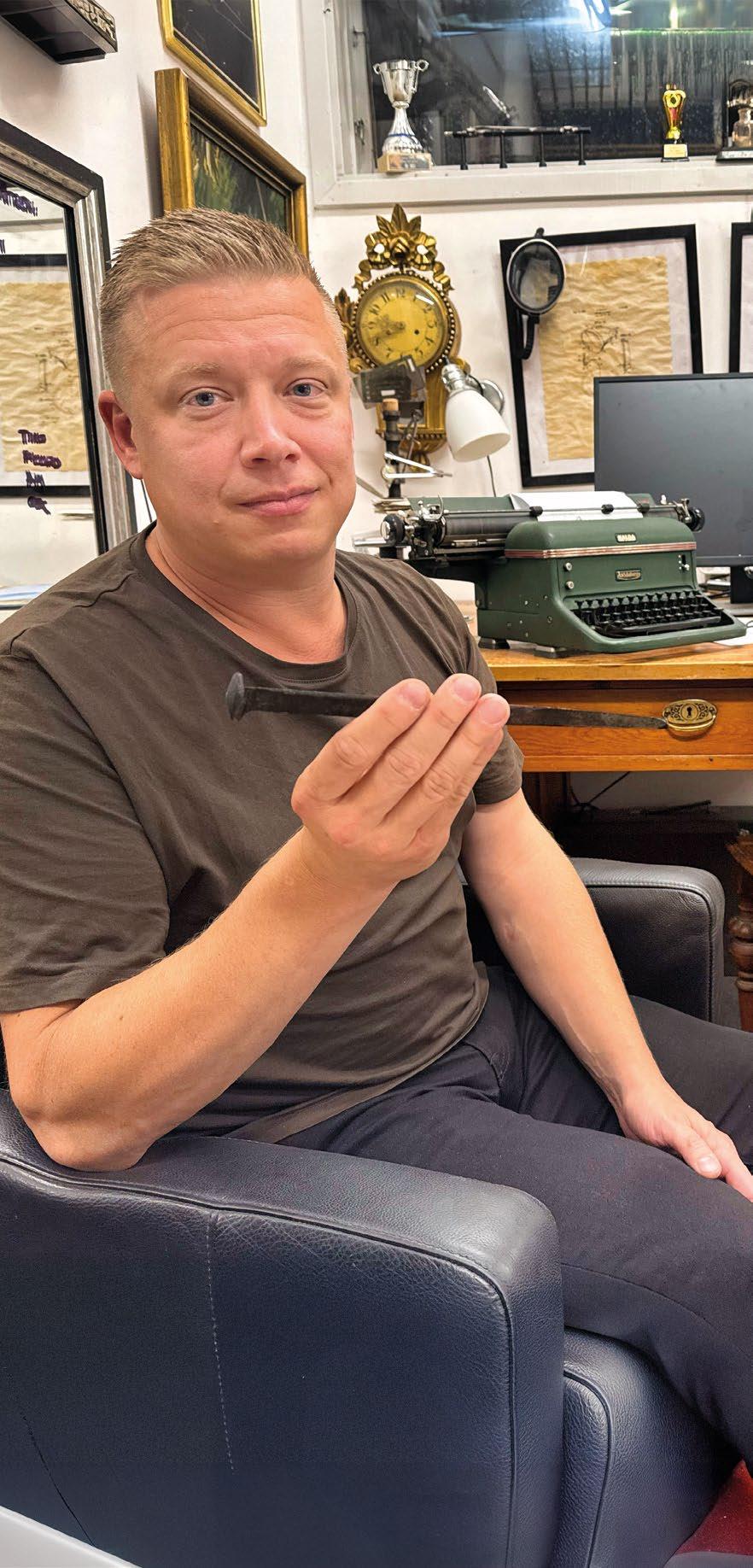 Thomas Wästvinds garage är fyllt av ägodelar med a ektionsvärde. Från en klassisk skrivmaskin av märket Halda, till originalspikar från Apotekshuset, ritat av Theodor Dahl. Thomas ck spikarna av en kompis efter renoveringen.