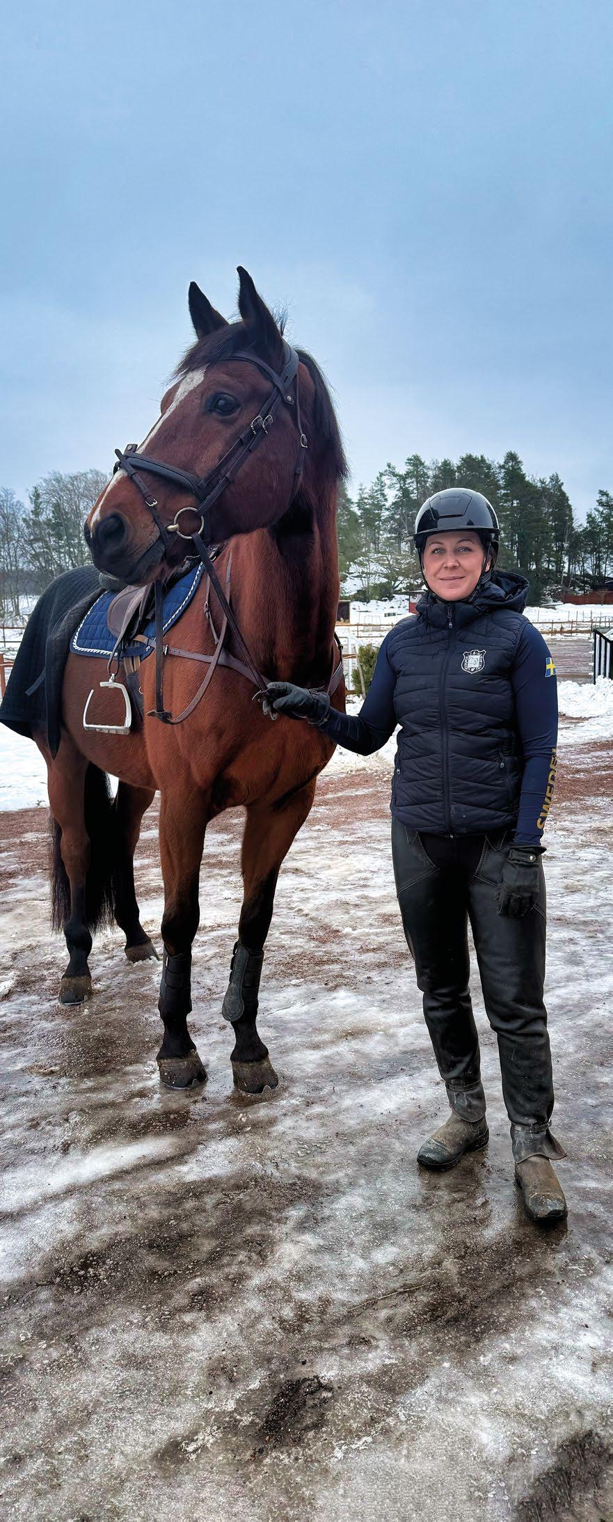 et var som starkast. Fritiden tillbringades nästan uteslutande i stallet, o a med långa dagar och sena kvällar. Tidigt stod det klart att hästlivet inte handlade om en tillfällig hobby – utan om grunden till den framtid hon ville bygga. När fick du din första egna häst? – I tolv–trettonårsåldern ck jag min första egna ponny. Det var en D-ponny som hette Brando, köptes från Eskilstuna och med en bakgrund som lovande inom hoppning. 30 000 kronor, inklusive sadel. Men Brando var ingen enkel häst. När jag tog över hade Brando redan hunnit få en senskada, stannade o a på hinder och kunde skena utomhus. Brando stallades upp i Åsby, mellan Kolsva och Köping, nära Fridas mormors hem. Med hjälp av en moster, som tog Frida under sina vingar, började Frida lära sig rida på riktigt. Vägen till stallet var lång, uppemot en mil, men hon tog sig dit varje dag – först på cykel, senare på moppe. Det första året handlade mest om att lära sig sitta kvar och skapa kontroll. Men ganska snart öppnade Brando dörren till tävlingsbanorna – och till en framtid som fälttävlansryttare.