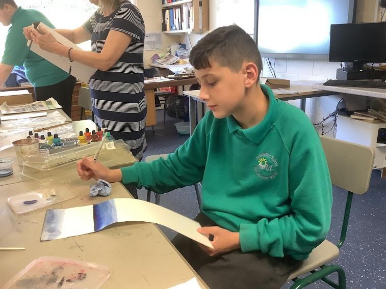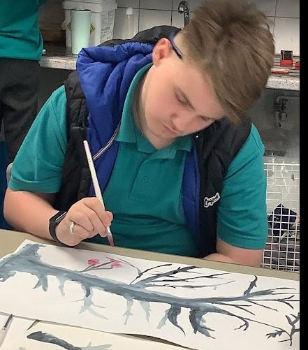 KS3 pupils used aJapanese brush to paint brush strokes for bamboo leaves, they used watercolours to paint a branch with blossoms. They learned about the Cherry Blossom Festival celebrated by the families picnicking under the trees.