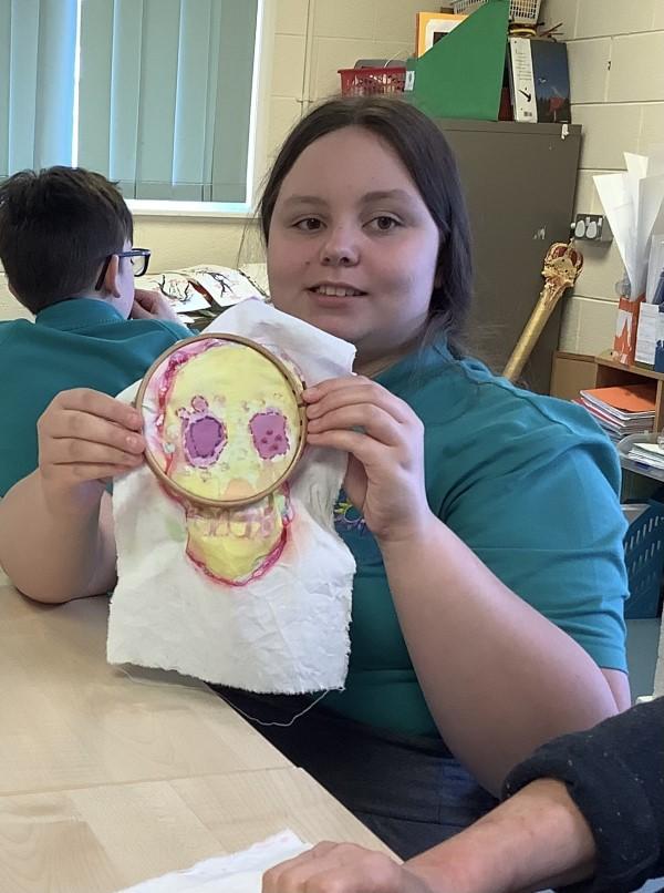 Discovery, Aspire, Enquire and the Textiles Options groups have all been exploring Textiles. They watched the Mexican Festival of the Dayof the Dead to study their brightly decorated and embellished Skulls/Masks.